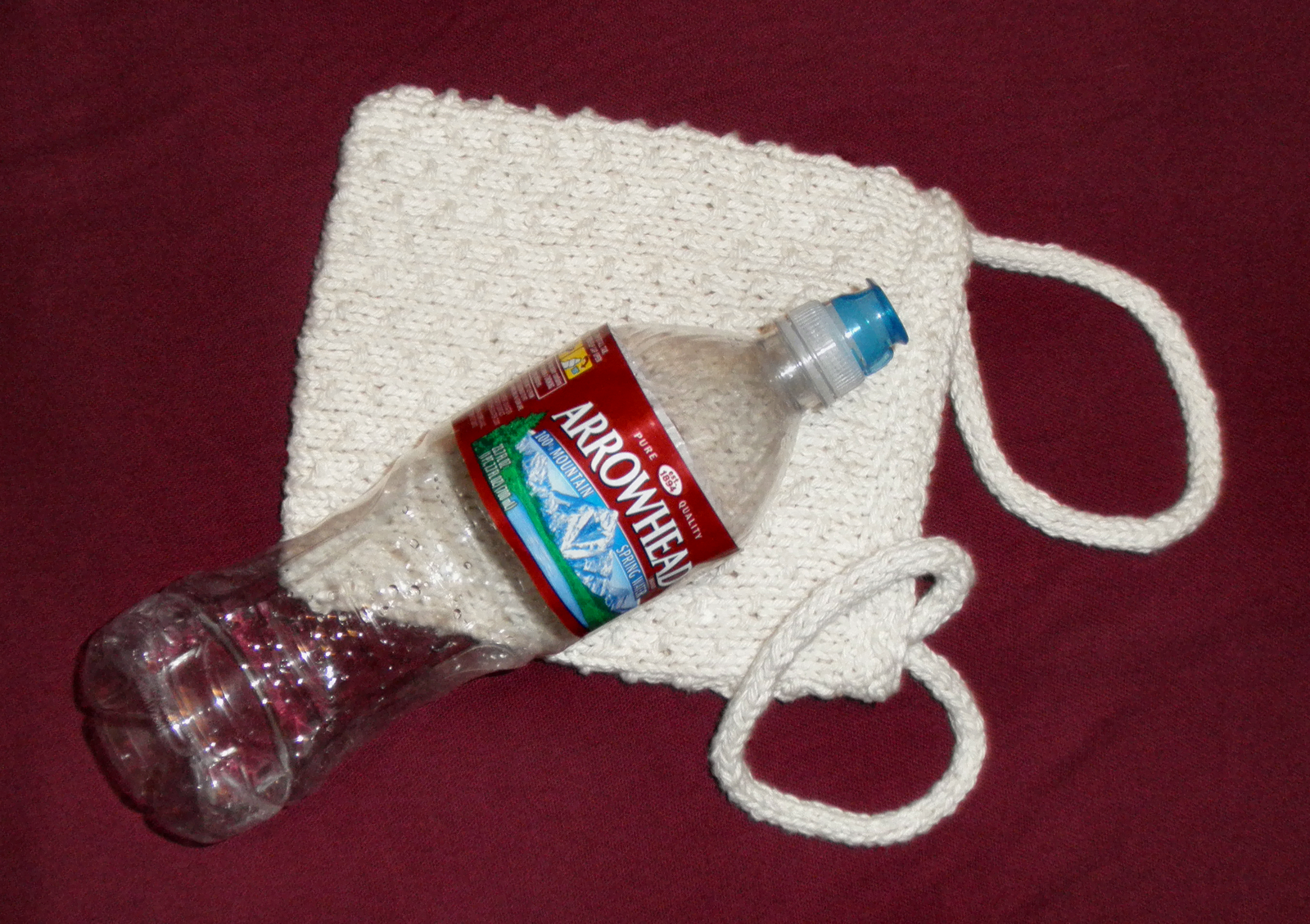 whiter yarn,and a bigger, taller bag. The version pictured here is 6" wide by 9" tall. It's a good size to hold a Kindle or a paperback book, a small knitting project, and/or sundry other accouterments.Hers is 8" wide by 12" tall; you could stuff a whole bunch of thingies in there. I'll leave the what to your imagination. I didn't get pictures of the one I made for her, but it's this one's big brother, pretty much. And white.